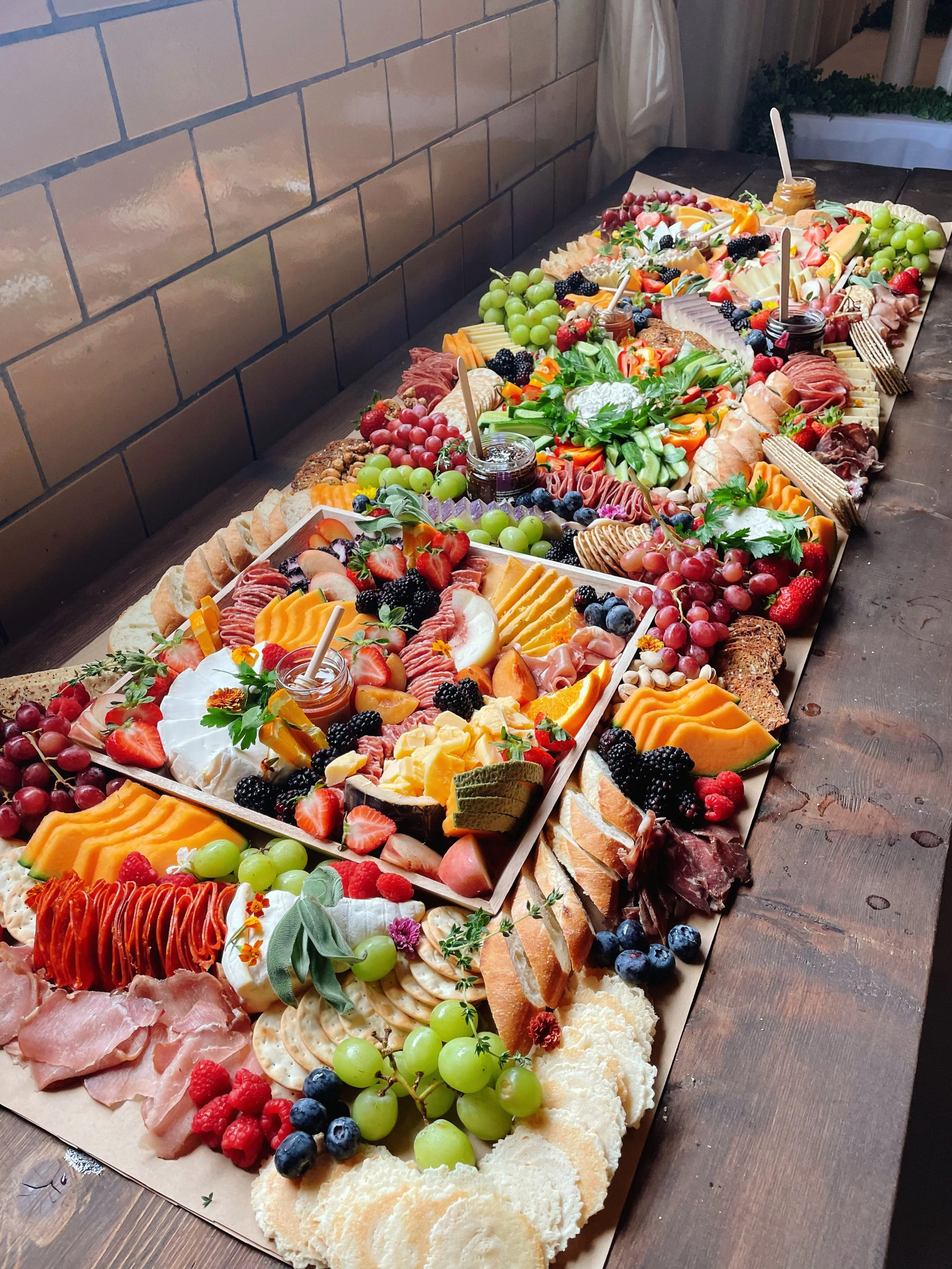 Each grazing table is custom-curated to the client. Includes your choice of artisanal cheeses, plus charcuterie meats, honey, jams, savory dips, seasonal produce, nuts, artisanal crackers, varying accoutrements such as: dried fruit, olives, chocolates, and garnish. Served on butcher paper.