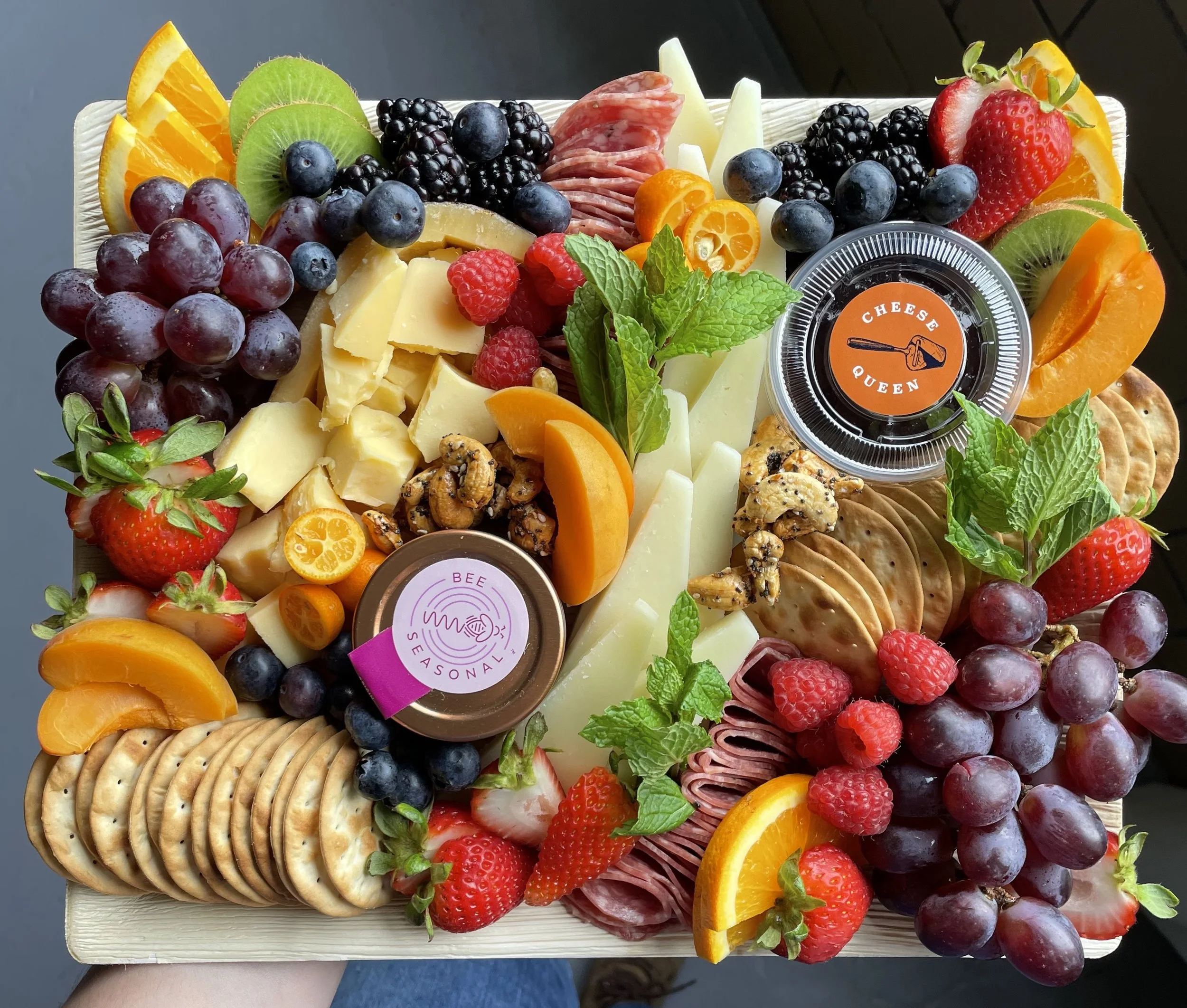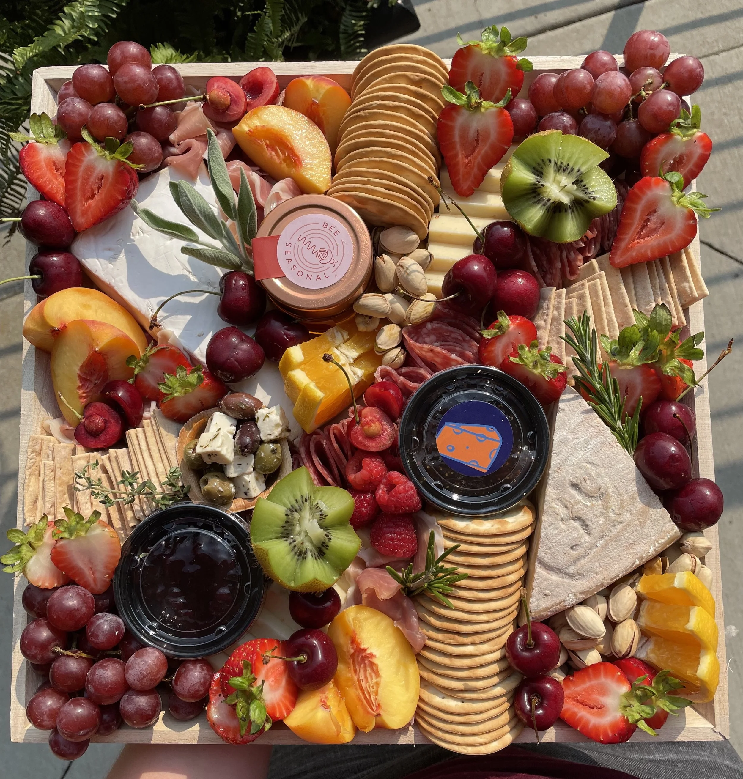 Includes your choice of 8 cheeses, plus 4-5 charcuterie meats, honey, jam, savory dip, seasonal produce, nuts, artisanal crackers, varying accoutrements such as: dried fruit, olives, chocolates, and garnish. Served on a disposable, eco-friendly board.