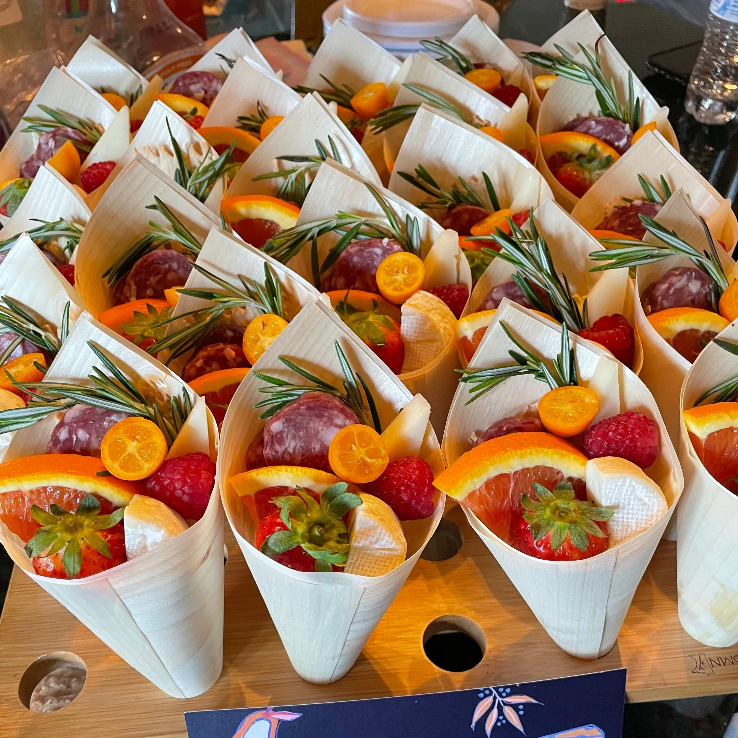 The perfect handheld snack for individual guests. Covid-friendly & practical, these cones are the cutest way to serve an appetizer. Each cone comes with assorted cheese, meat, fruit, nuts, and crackers. Cones are customizable to each client per request.
