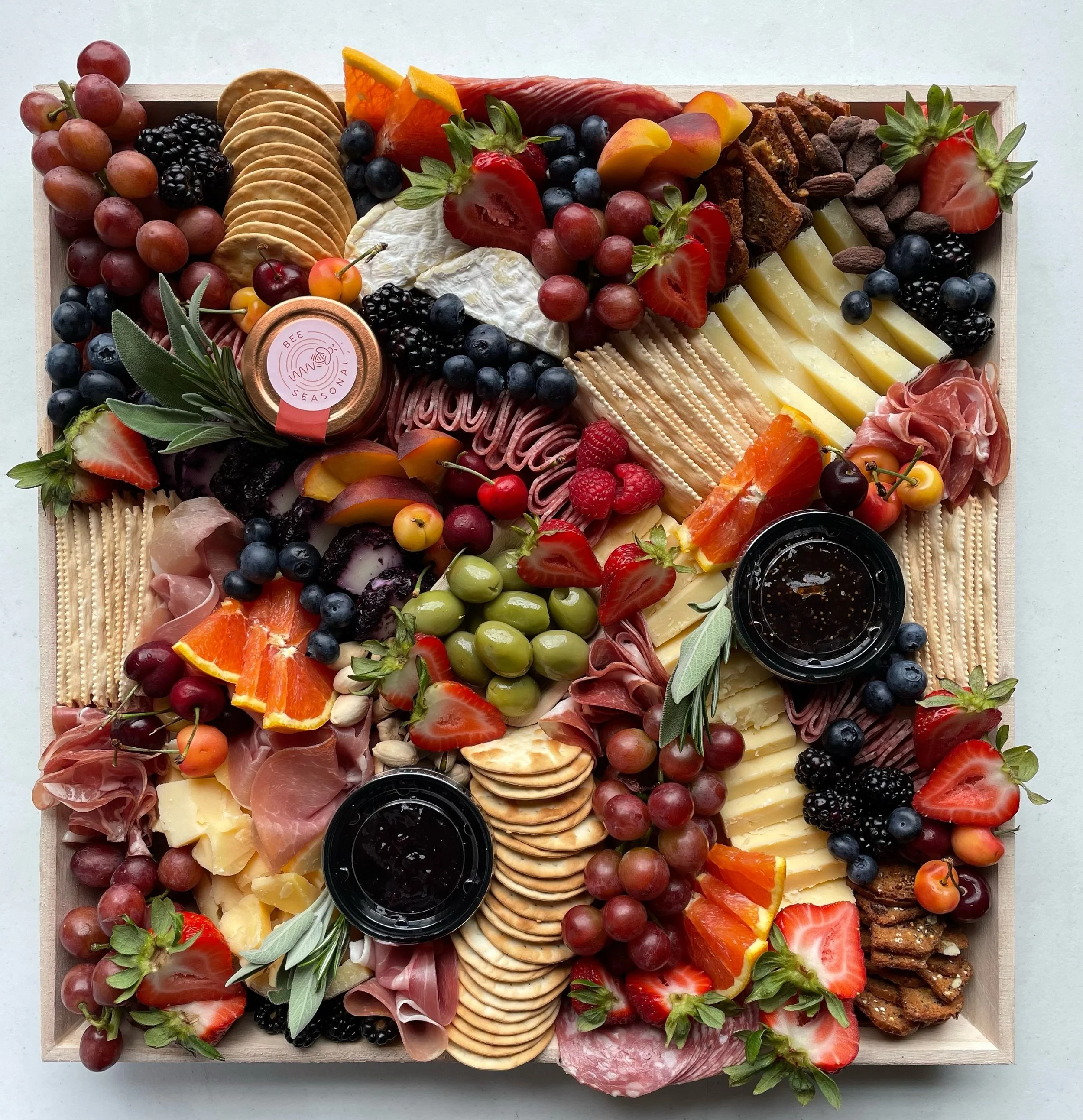 Includes your choice of 3 cheeses, plus 2 charcuterie meats, honey, jam, seasonal produce, nuts, artisanal crackers, and garnish. Served on a disposable, eco-friendly board.